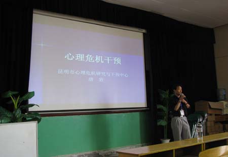 5.12汶川大地震后,一幅幅憂傷無助,驚恐無奈的小面孔展現(xiàn)在我們面前,人禍,天災(zāi),都將給幼小的心靈帶來巨大的傷害,在此同時,全國各地組織了針對失學(xué)兒童的各項措施,云南省接受了安排部分失學(xué)兒童異地就學(xué)的任務(wù)。來昆就學(xué)兒童共有441名兒童,其中昆鋼實驗學(xué)校接收了43名,雖然全校上下均給予高度的重視和兒童關(guān)懷,但大多數(shù)孩子都很想家,有的為此事哭鬧不止,為了更好的開展工作,做好地震災(zāi)區(qū)來昆學(xué)習(xí)兒童的心理危機(jī)干預(yù)工作,2008年6月6日下午16:00,校方邀請本中心專家,副主任醫(yī)師唐巖到昆鋼實驗學(xué)校對100名老師進(jìn)行了引人入勝,繪聲繪色的講課,內(nèi)容圍繞危機(jī)干預(yù)基本理論、措施,著重講解了災(zāi)后小學(xué)生的心理健康,如何使用危機(jī)干預(yù)技術(shù)對孩子進(jìn)行心理干預(yù),并介紹了相關(guān)訓(xùn)練方法。