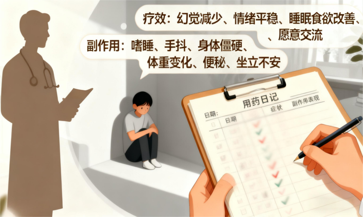 · 療效:他的幻覺是否減少了?情緒是否平穩(wěn)些了?睡眠和食欲有改善嗎?愿意和家人說(shuō)話了嗎?