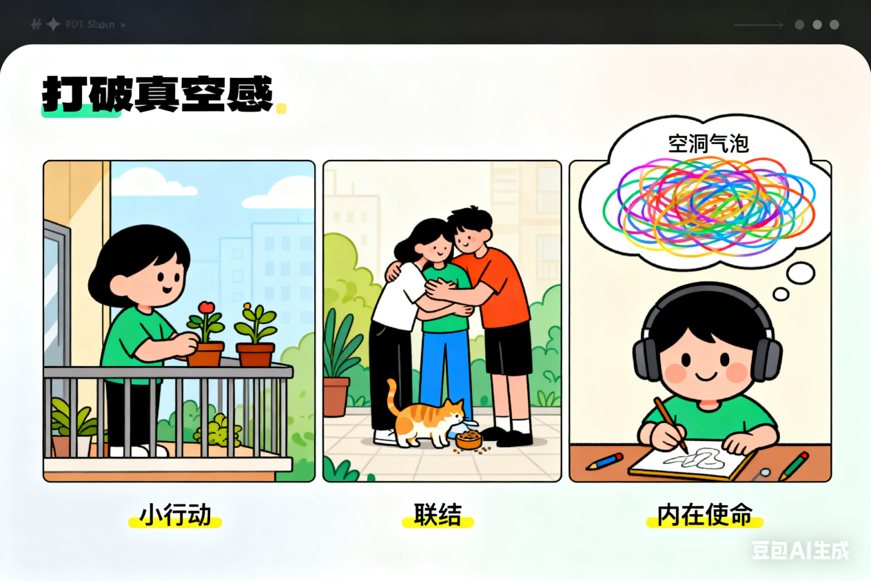 真空感往往伴隨著“無力感”——覺得自己無法改變現(xiàn)狀,于是陷入迷茫。此時,不必追求“驚天動地”的改變,不妨從一件力所能及的小事做起:每天花30分鐘閱讀一本喜歡的書、學(xué)習(xí)一道新菜、堅(jiān)持晨跑10分鐘……這些“小行動”能帶來“小成就”,而“小成就”會逐漸積累成“掌控感”。當(dāng)我們感受到自己能主導(dǎo)生活的一部分,內(nèi)心的空洞就會被一點(diǎn)點(diǎn)填滿。