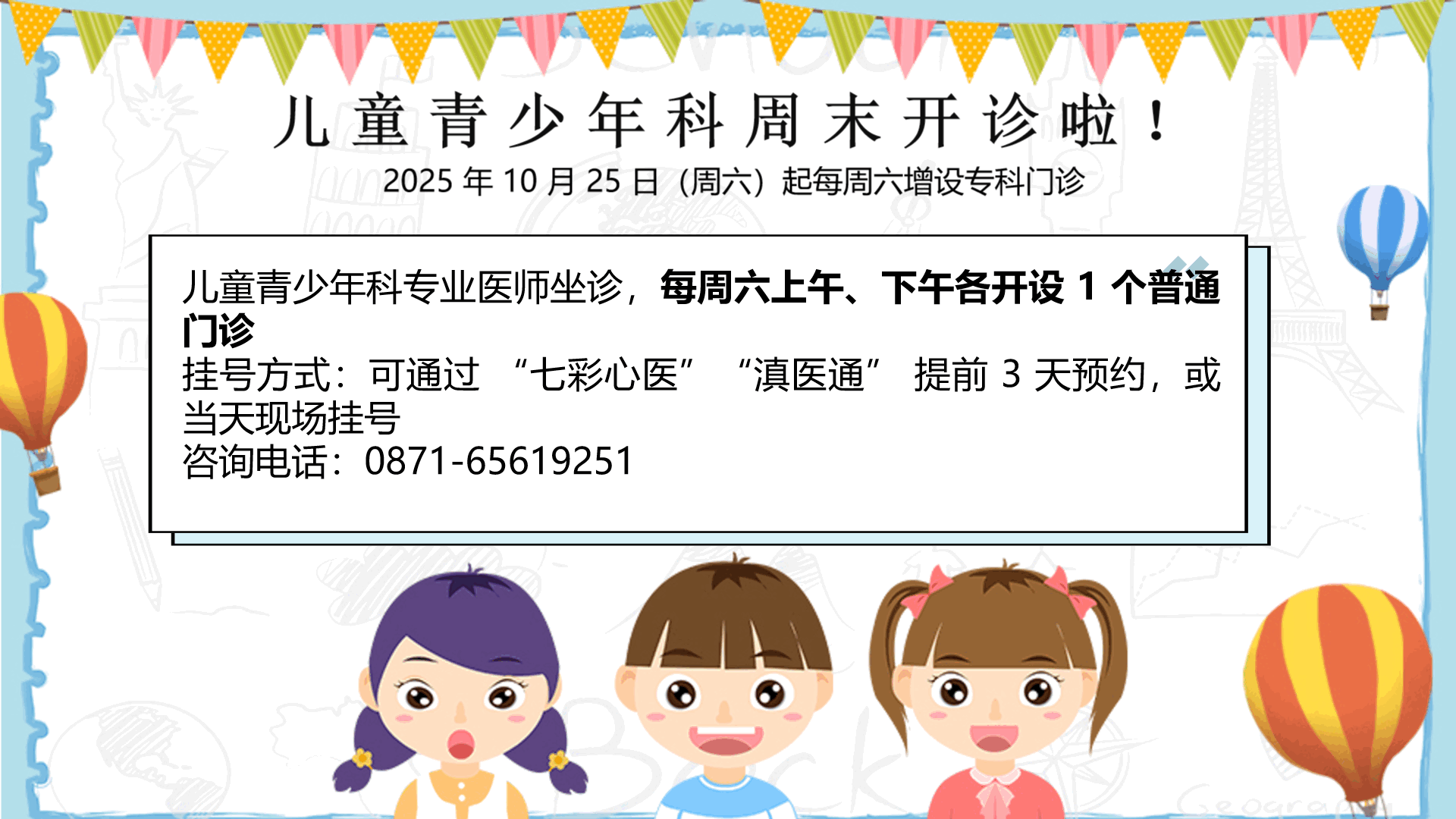 請(qǐng)各位家長(zhǎng)根據(jù)孩子的需求,合理選擇就診時(shí)間。就診人員可通過七彩心醫(yī)、滇醫(yī)通提前三天預(yù)約掛號(hào)或當(dāng)天現(xiàn)場(chǎng)掛號(hào),有疑問可撥打兒童青少年科電話(0871-65619251)咨詢。